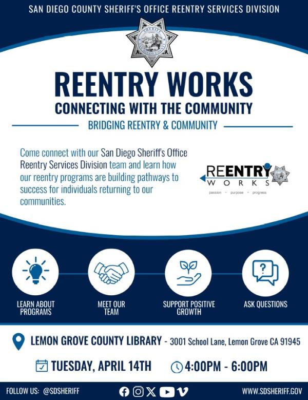 April 13, 2026 (Lemon Grove) -- The San Diego County Sheriff’s Office Reentry Services Division is holding a public event aimed at bridging the gap between life behind bars and life as a productive neighbor.