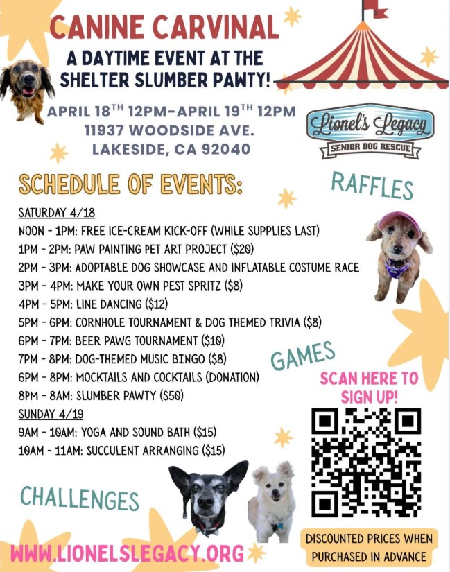 April 14, 2026 (Lakeside) — East County-based senior dog rescue group Lionel's Legacy is holding a day of games, community and advocacy on Saturday, April 18 at the Rock House in Lakeside.