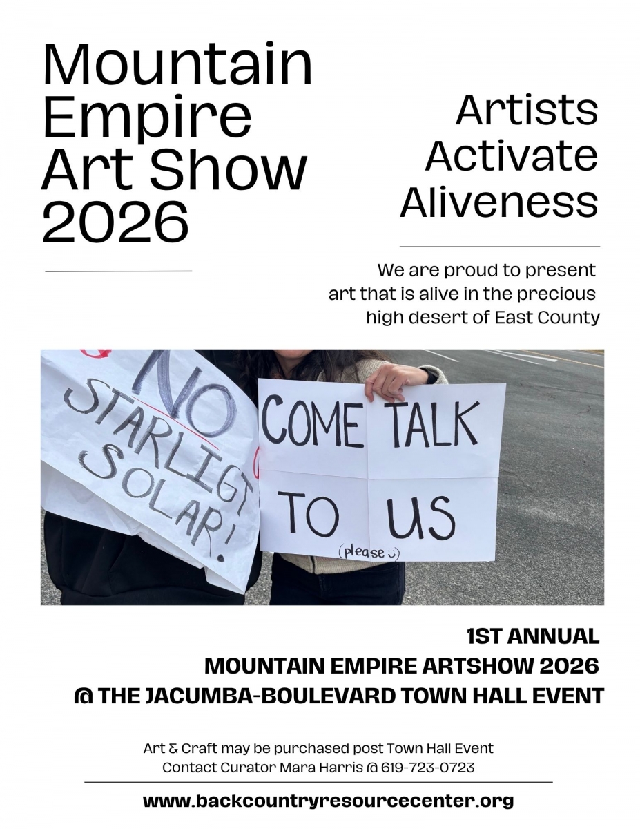 April 14, 2026 (Boulevard) -- The Backcountry Resource Center in Boulevard will be busy this Wednesday, April 15 hosting the first-ever Mountain Empire Art Show 2026, opening at 4 p.m. and the Boulevard-Jacumba Town Hall Event at 6:30 p.m.