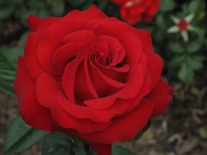 Photo, right: Ingrid Bergman rose, Hunter's Nursery