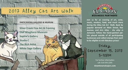 September 5, 2025 (El Cajon) -- Local artists and galleries are coming together to host the 14th Annual Alley Cat Art Walk on Friday, September 12th from 4pm to 8pm in Downtown El Cajon. This free, family-friendly event promises fine art, live entertainment, boutique vendors, and more along Main Street and Rea Avenue.