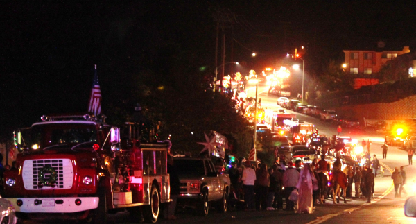December 7, 2015 (Alpine)—Santa and Mrs. Claus rode in on a fire truck as Alpine’s Parade of Lights rolled through town. The procession included everything from donkeys to big rigs—all festooned in holiday lights.
