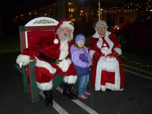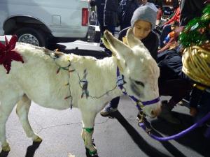 Santa and Mrs. Claus greeted children, while parade participants also mingled with the crowd. A goat sported reindeer antlers and a donkey shimmered in the night with Christmas lights.