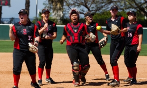 The game was a pitchers’ duel between Aztec (12-8) freshman Marissa Moreno (Torrance, Calif.) and Titan (10-11) senior transfer Kelsey Kessler. Moreno (6-3) allowed two runs on five hits over 5 2/3 innings, striking out five. Kessler (7-4), meanwhile, yielded just four hits and two walks in the complete game shutout, striking out four. SDSU junior Alex Formby (Orange, Calif.) relieved Moreno in the sixth and got the only batter she faced out.
