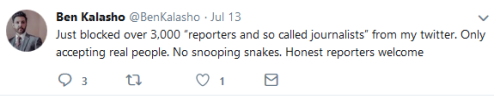 July 14, 2018 (El Cajon) – Yesterday, El Cajon Councilman Ben Kalasho posted on Twitter, “Just blocked over 3,000 `reporters and so-called journalists’ from my twitter. Only accepting real people. No snooping snakes. Honest reporters welcome.”