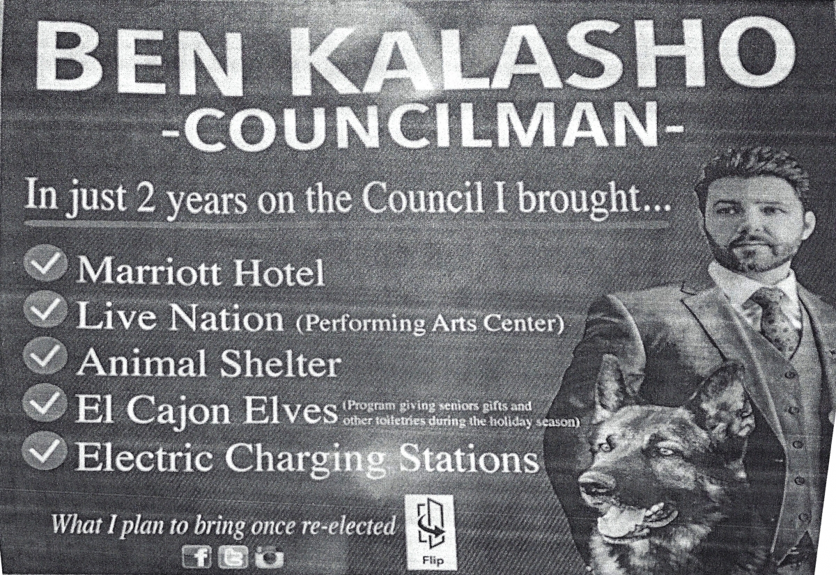 August 31, 2018 (El Cajon) – On his campaign literature, El Cajon Councilman Ben Kalasho has made some inflated claims about his record. Here’s how the facts compare to the claims.