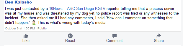 November 1, 2017 (El Cajon) – El Cajon Councilman Bessmon "Ben" Kalasho has escalated his war on media outlets that have published factual investigative reports on his business, political, legal and ethical controversies.