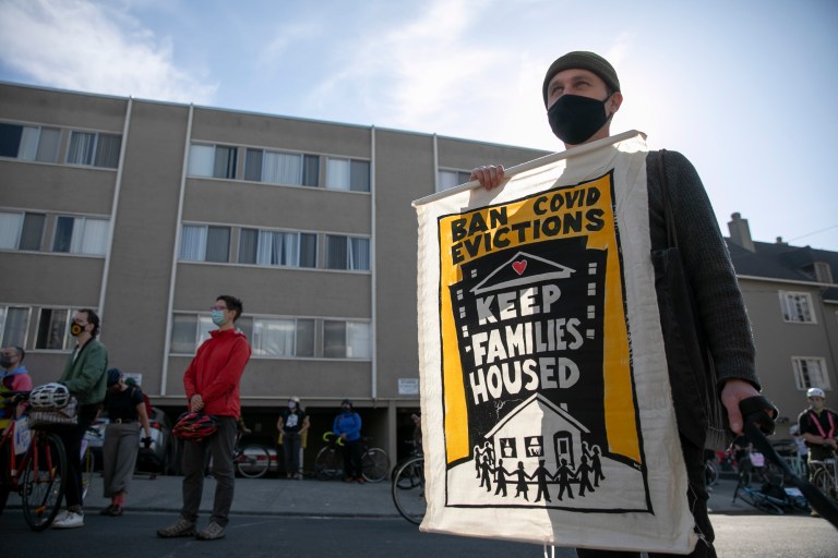 Photo, right: Oakland resident Andrew Rosenburg holds up a banner while protesting rent evictions during the pandemic on Dec. 5, 2020 in Oakland. Photo by Anne Wernikoff, CalMatters