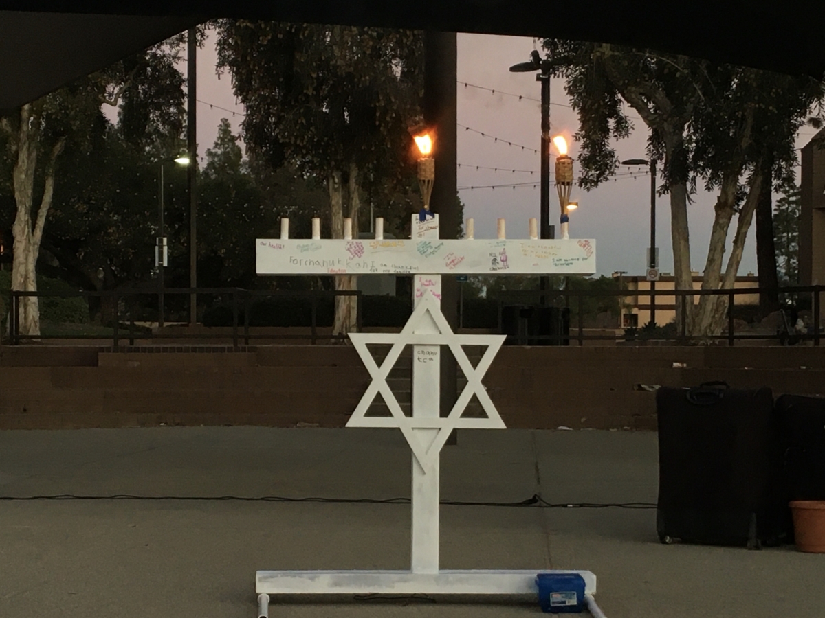 The event featured a “Menorah of Gratitude” with messages of thanks handwritten on it, a “Menorah of Giving” that offered eight baskets as a chance to fill specific needs of El Cajon families through the Jewish Family Service, a children’s craft station to make decorated menorahs, and delicious treats including latkes from The Place Catering and jelly donuts from Lang’s Bakery, both local El Cajon businesses.