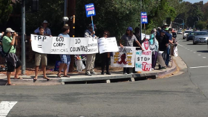 May 8, 2014 (San Diego)-- Labor and community groups lined the streets outside a fundraiser featuring President Barack Obama today to protest the pending Trans-Pacific Partnership (TPP) Free Trade Agreement, a pact they say threatens to ship California jobs overseas.  The Democratic fundraiser was held at the home of Irwin Jacobs, founder of Qualcomm, a high-tech company that already does much of its production overseas and has been lobbying for the TPP.