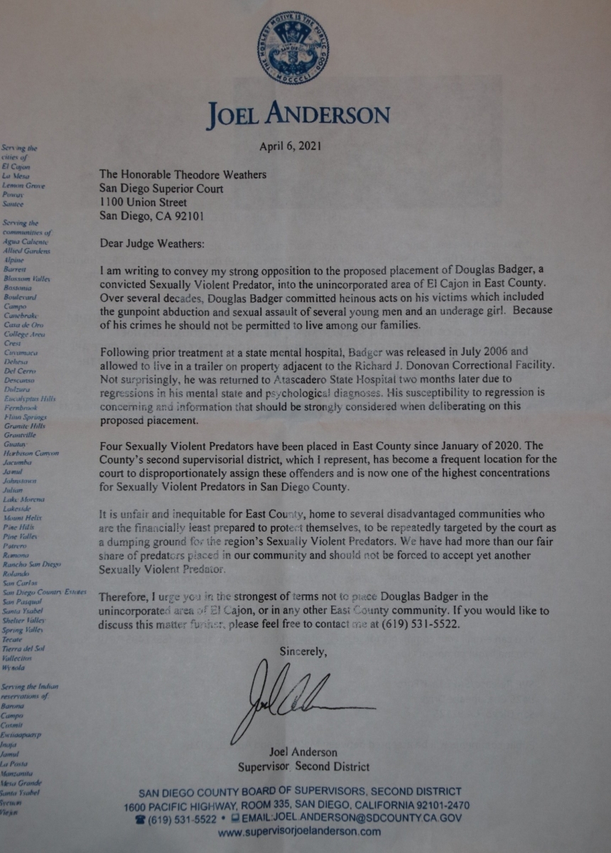 County Supervisor Joel Anderson (Second District), who was unable to attend personally because the Board of Supervisors had its meeting at the same time, submitted a letter to Judge Theodore Weathers, the judge presiding over the placement of the sexually violent predators, stating his opposition to the move.
