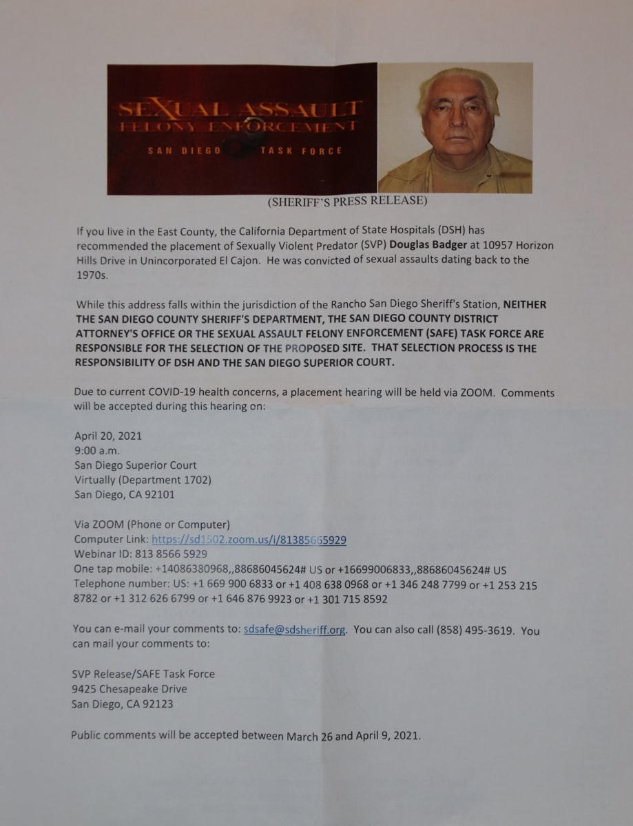 Public comments can be emailed through April 9 to sdsafe@sheriff.org or by calling (858)495-3619, or via mail to SVP Release/SAFE Task Force, 9425 Chesapeake Drive, San Diego, CA, 92123.