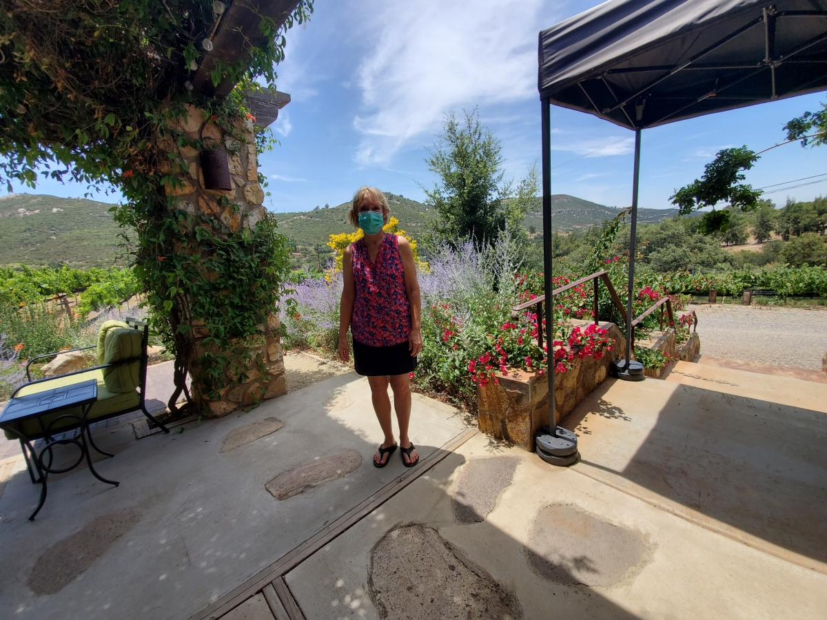 Photo: Susanne Sapier, president of the Ramona Valley Vintners Association, wears a mask as she prepares to greet visitors at Vineyard Grant James, where she is the winemaker.