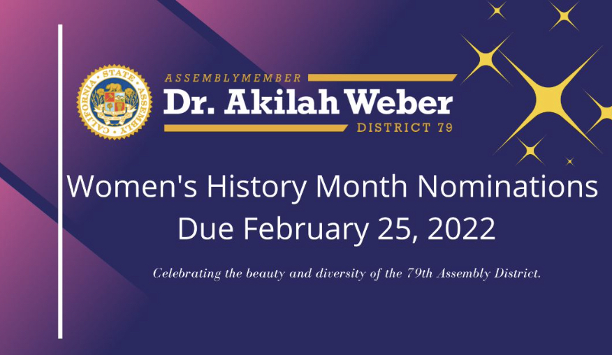 February 18, 2022 (San Diego) -- In preparation for Women's History Month, Assemblywoman Akilah Weber invites constituents to submit your nominations bFebruary 25 for women leaders in the following three categories:
