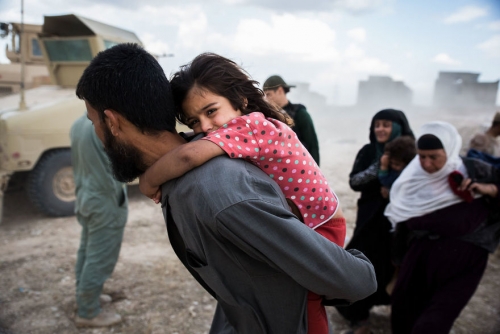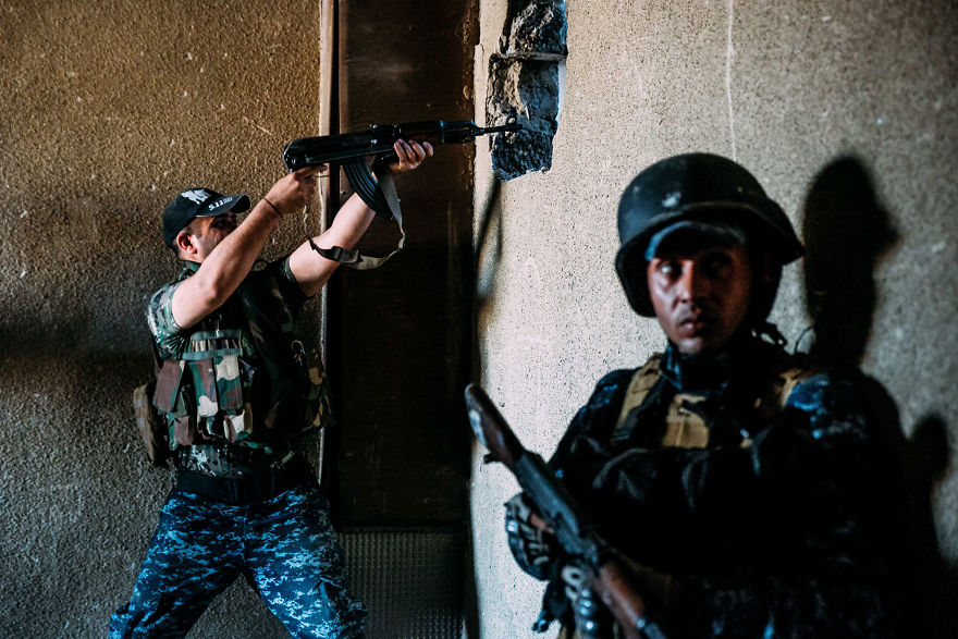 His images show Iraqi federal police fighting to free Mosul from occupation by Islamic State, or ISIL, militants who seized the city in June 2014. The photos poignantly depict the courage of soldiers and at times, fear, as they fight amid the ruins and also the anguish of residents and refugees fleeing the city.