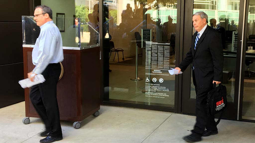 Photo, right: Former Rep. Duncan L. Hunter, leaving court last week, said of two U.S. prosecutors who attended a Hillary Clinton fundraiser in 2015: “You pledge allegiance to the candidate when you’re taking a VIP photo with them.” Photo by Ken Stone