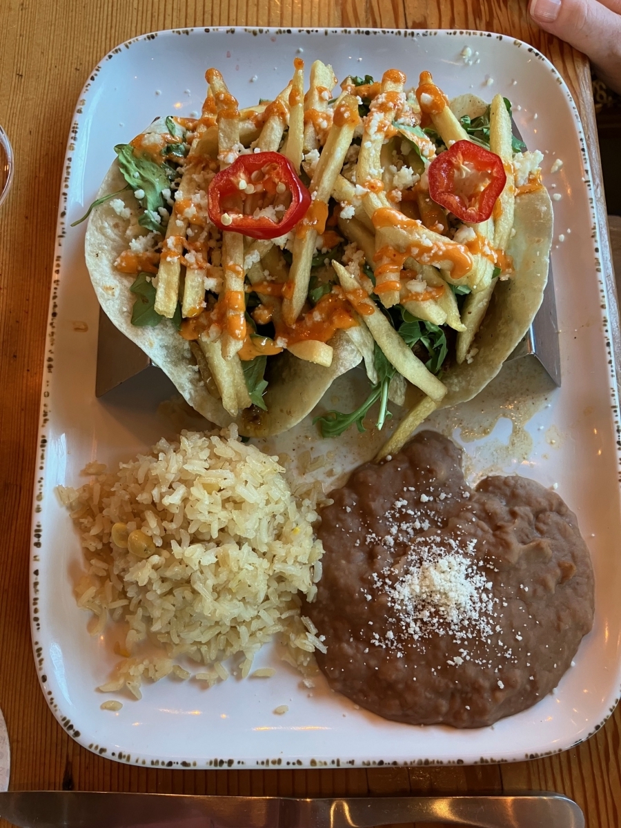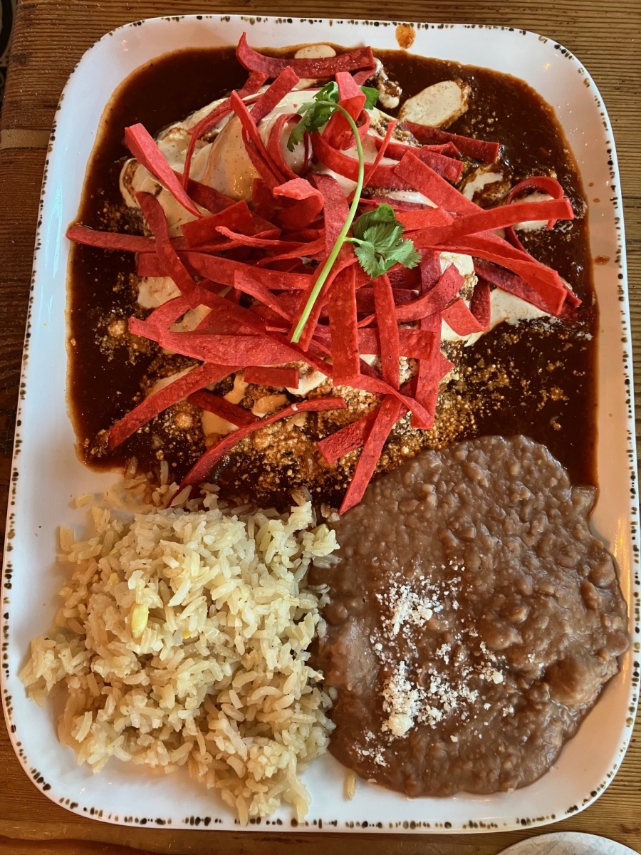 Then comes margarita time. The House lime flavored margarita is perfect and only $8 during Happy Hour. The blackberry basil mezcal margarita is delicious, but a bit too sweet. There are other margarita options as well as tequila and mezcal choices for mixed drinks or shots. Alcoholic beverages range from $6.50 to $10 during Happy Hour, non-alcoholic selections are in the $5 to $6 range. Gaby’s Handcrafted Michilada is 26 ounces for $10. Margaritas are also served by the pitcher for $32. There are red and white wines available, sangria, and Gaby’s Blond Ale. Tinto de Gabriela is a Nebbiolo produced for the restaurant by the Villa Montifiori winery in the Valle de Guadalupe region of Baja California, Mexico near Ensenada.