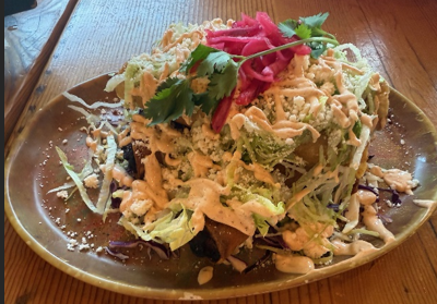 The Caesar Salad is made with toasted chile de arbol croutons, roasted tomatoes, basil, shaved cotija enchilada, and spiced pepitas. Chicken barbacoa nachos come with serrano, pico de gallo, candied jalapenos and a variety of three cheeses including Asadero, cotija and Oaxaca. The TJ Dogs are bacon wrapped with cilantro aioli, jalapeno, and caramelized onions. The Coctel de Camaron is made with chilled shrimp, fire roasted cocktail sauce, charred lemon and horseradish crema. Ceviche Verde is prepared gluten free using local white fish, tomatillo salsa, cilantro, and lime. Esquites (Mexican street corn salad) is fresh grilled corn, cotija, mayonnaise, cilantro, and tajin. It’s gluten free.
