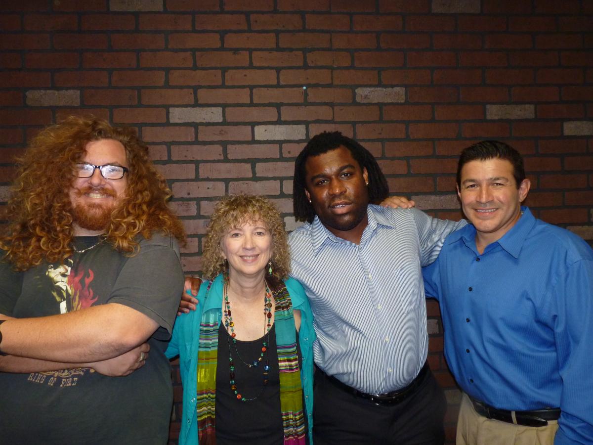 Photo, left to right: ECM sportcaster Ed Barrena, producer Miriam Raftery, sportswriter Devoreo Bell, and "Boltman" Dan Jauregui
