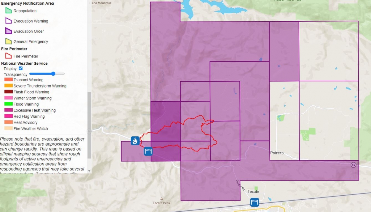 The fire is burning eastward, with zero containment, and has crossed State Route 94 on the eastern portion of the fire. Structures are threatened, at least one has burned, and more than 400 homes have been ordered to evacuate tonight as the fire burns at a critical speed. Mandatory evacuation areas include much of Potrero, Barrett Junction, Dulzura and Tecate.
