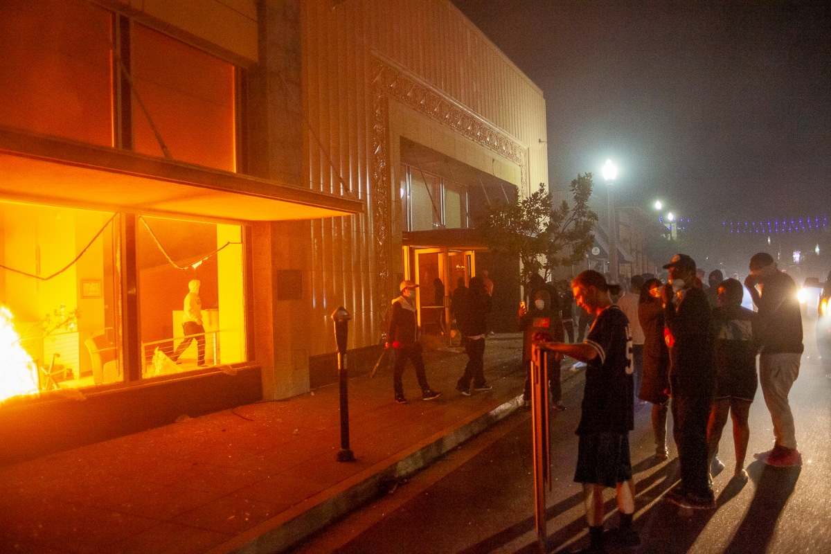 Photo, right, by Jake Rose: The individual carrying a baseball bat was earlier shown committing arson inside the Randall Lamb building in separate video livestreamed by another photographer.