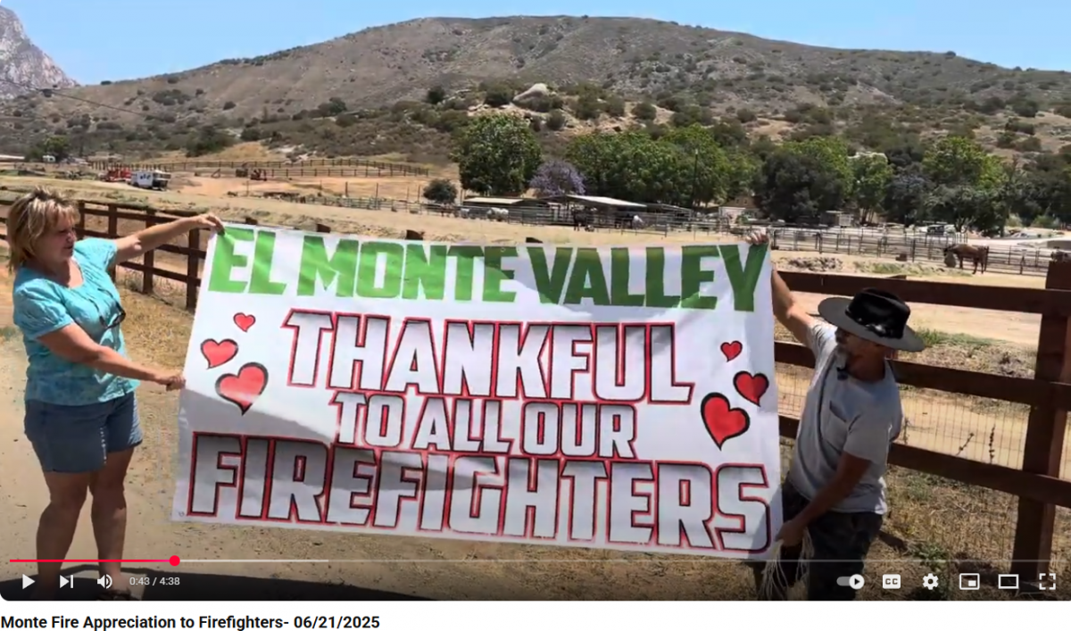June 23, 2025 -- Photographer Shiloh Ireland provided this video of Lakeside residents Sarah Ann WIlson and BIlly Ortiz unfurling a banner to thank firefighters who worked tirelessly to protect homes and halt the Monte Fire in Lakeside's El Monte Valley.