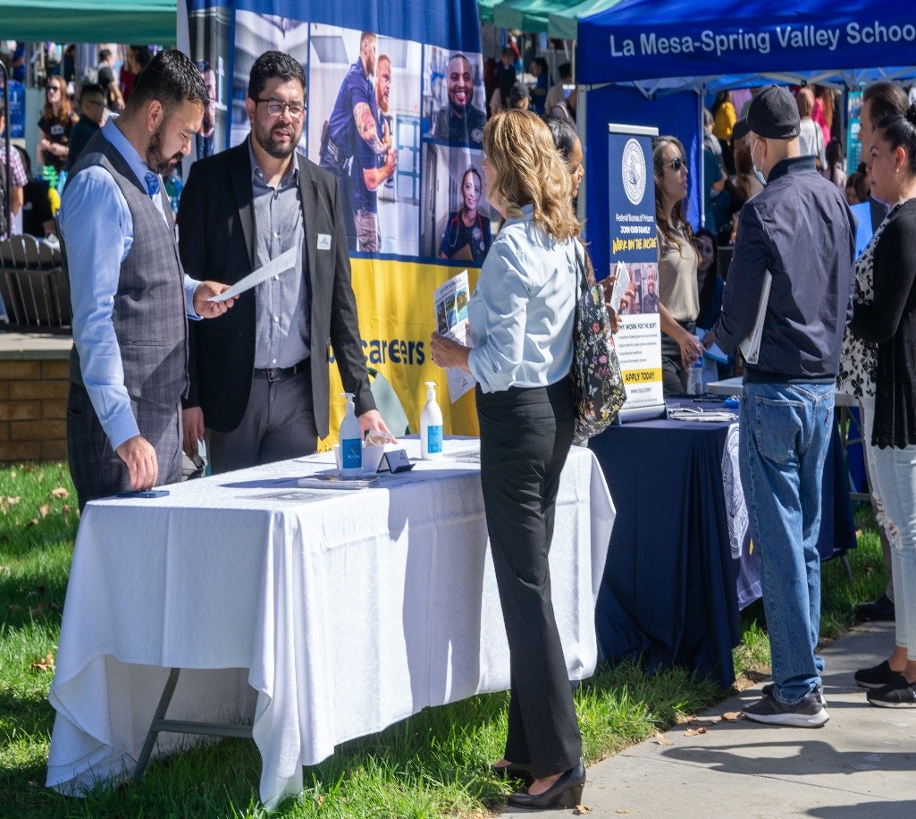 Photo: job seeker conversing with recruiters at Grossmont College job fair