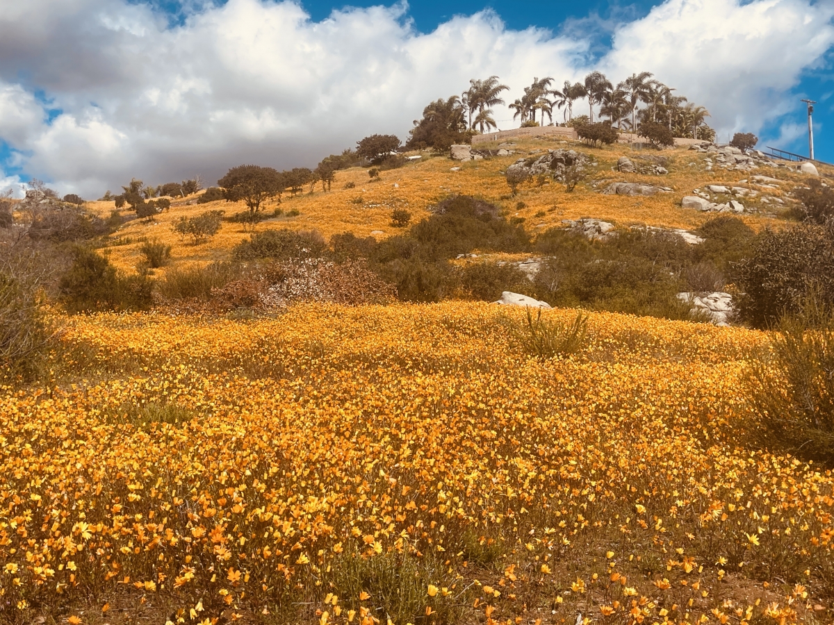 February 27, 2023 (Ramona) – Looking for wildflowers? You don’t have to go all the way to Anza-Borrego. Henri Migala took these colorful photos of a hillside abloom in orange and yellow daisies along the Old Julian Highway in Ramona yesterday.
