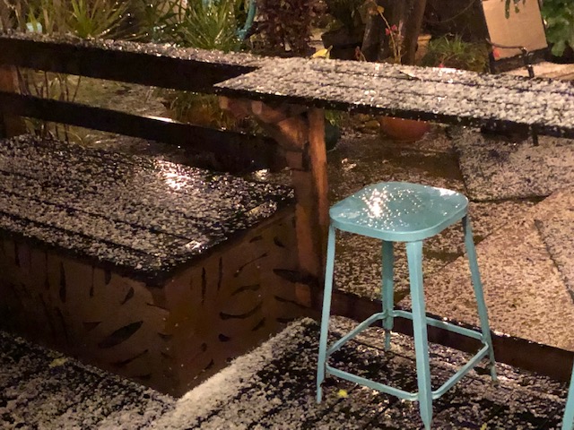 February 27, 2023 (Roland) -- A rare hailstorm pelted much of San Diego County on Saturday night. Pat Bennett of Rolando sent in these photos, stating, "I have lived in San Diego for 55 years and have never seen more than a few hailstones fall. Tonight, my garden, deck, patio furniture and roof were covered with it!"