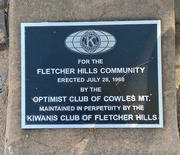 Thanks also to the Kiwanis Club of Fletcher Hills. Since the early 1980s it has, as the plaque at the base of the flagpole states, “maintained it in perpetuity.”