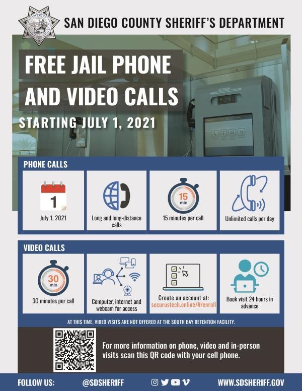 June 11, 2021 (San Diego) - Beginning July 1, all phone calls and video calls from San Diego County Sheriff's Department Jails will be free.