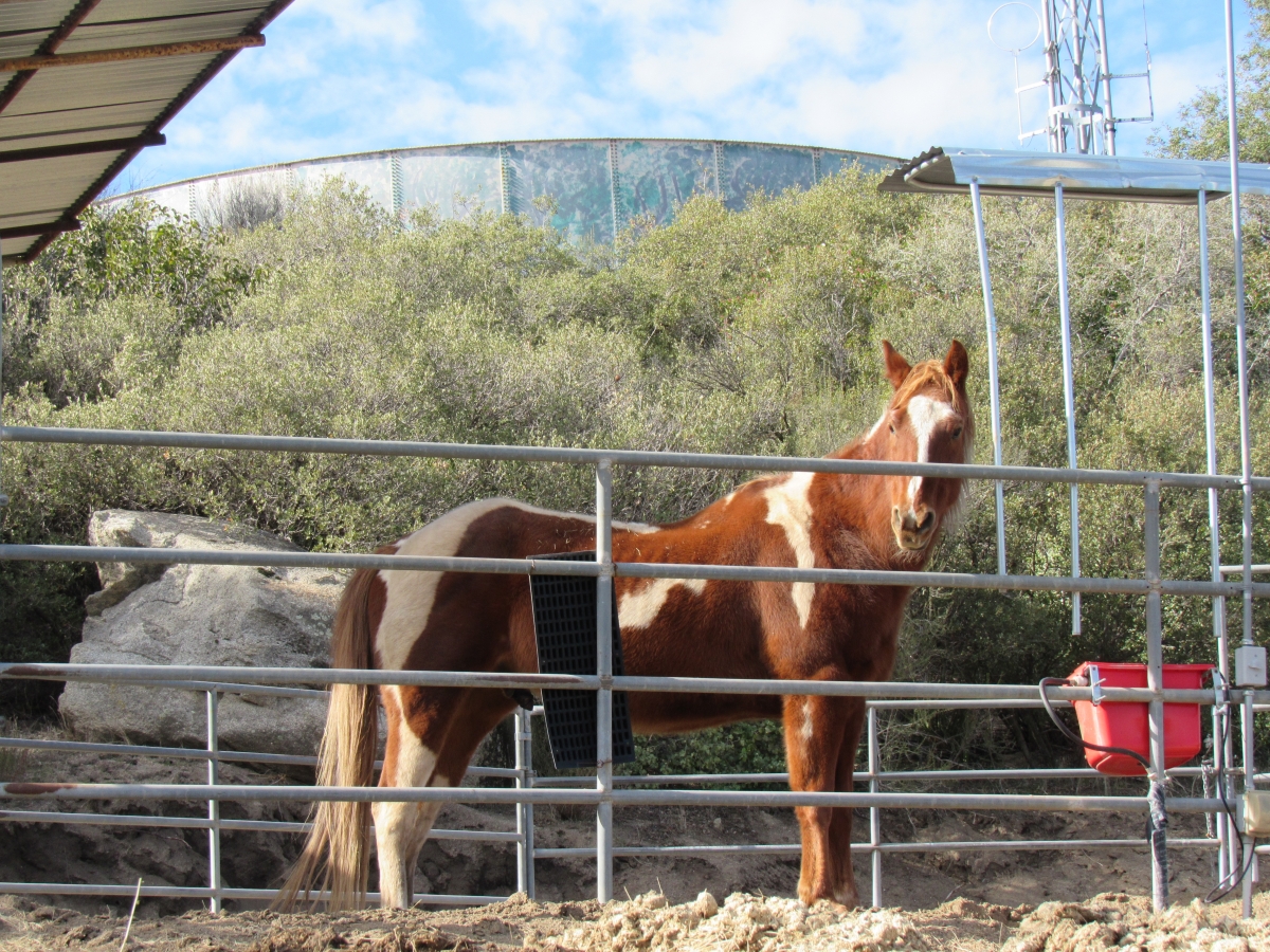 Photo, right: Horse Starshine in front of water storage tanks. Some residents voice concerns over health impacts of nitrate-contaminated water on pets, livestock and wildlife as well as humans.