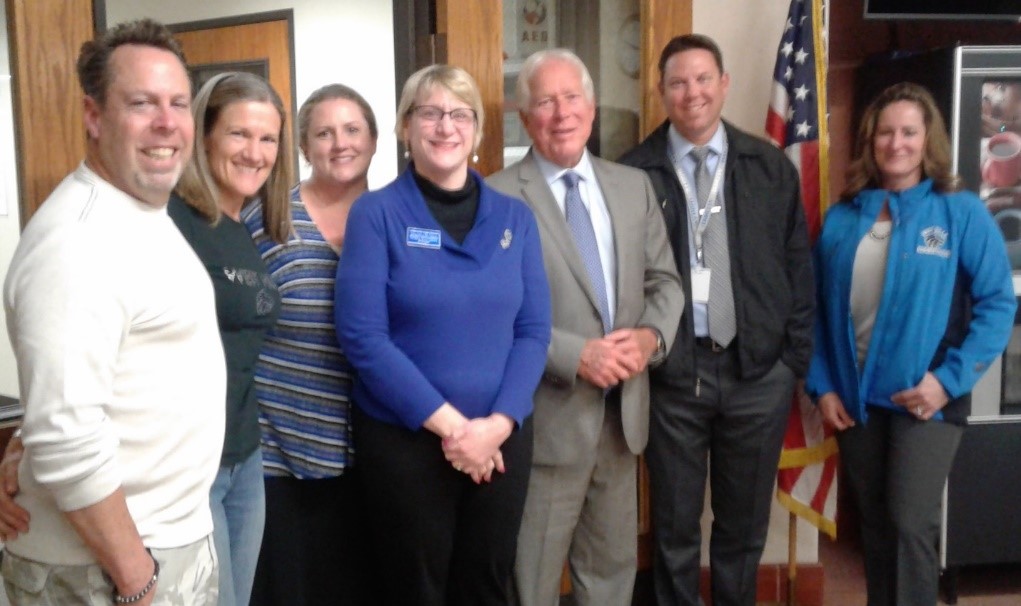 Photo, right: Steve and Debbie Dissinger, April Baker (Assistant Principal), Robin Ballarin (Principal), Bob Guess (Founding Principal), Josh Reiderer (Assistant Principal), JoAnn Johnson (Assistant Principal) in support of naming the gymnasium on the West Hills High School campus the David C. Hunter Gymnasium. January 22, 2018.