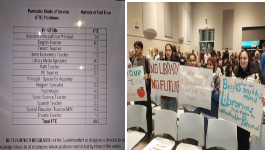 Photos, right: screenshots of an email detailing the positions to be cut, as well as protestors at the facilityPublic speakers urged the board to protect the positions