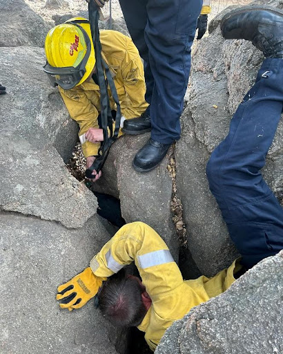 Cookie, an 85-pound Rottweiler, had fallen into a crevasse between rocks in Lyons Valley and became stuck. Firefighters from Station 32 Lyons Valley and Station 36 Jamul responded, using a jackhammer, pick hammer,cribbing, webbing, and soap to free the dog.After working more than three hours, firefighters were able to extricate Cookie.