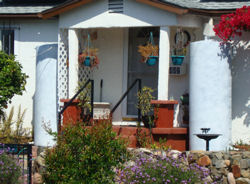 So the Dolphins installed two, 250-gallon water tanks on either side of their entry porch. Painted to blend right into the stucco exterior of the house, the tanks gather rainwater off the roof and provide all the irrigation water the Dolphins need for their lovely front yard and vegetable garden.