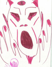The author explained in an email to me two of these illustrations on pages 86 and 87 of her book thusly: “The significance is, I suppose the terror in creating them. The page 86 sacrifice was produced with no thought, it simply emerged. I think the drugs and brainwashing tactics used on me to prevent me from telling fragmented my memory so recovery was that much more difficult. The same figures emerged again and again in art work. I used the first person, present tense voice of a dissociating child of about four years of age because it came to me as if that child has an independent sort of existence within me and her ‘voice’ is readily accessible. There is really nothing unusual in the splitting off of intolerable experiences through dissociation and I am sure you are familiar with it.” I am really not so sure that I am! Payne further goes on to state in regard to her illustrations in the book and what she shared with her therapist: “The shrieking image on page 87 was created in the same way. Without thought, it exemplifies the horror I felt. The feelings of exhaustion, misery and shame and the wish to have evaded creation are all in that scream. The division of memory from feeling and the healing that came at great price from fusing memory with the feelings that had been split off from each other are the source of the healing. I was lucky in having a therapist who understood all about these sorts of experiences and in having God’s presence. Without Him I would not have recovered.”