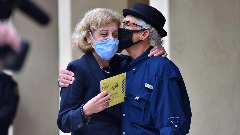 Photo, right: Neil Senturia and mayoral candidate Barbara Bry get ready to vote at a La Jolla library on Election Day 2020. Photo by Chris StoneHow would he respond to those who’d call the book a reputation-rehab effort?