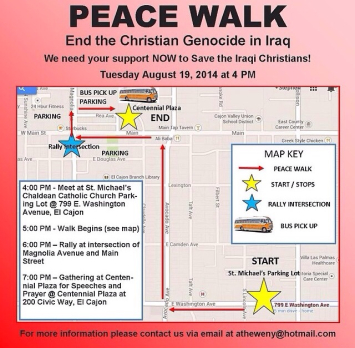 August 21, 2014 (El Cajon) – Chanting “Save Iraq, save humanity,” and “Save Iraqi Christians,” hundreds of Iraqi-Americans marched through the streets of El Cajon on Tuesday. Many are gravely concerned about family members trapped in Iraq or who have fled as refugees as terrorists now calling themselves the Islamic State have seized cities across Iraq, torturing , killing or kidnapping those who refuse to convert to Islam. The community showed support, with many motorists honking horns and drawing cheers.