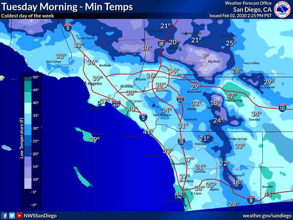 Monday through Wednesday, a hard freeze watch is in effect for the high deserts, where temperatures could dip into the high teens to low 20s and snow flurries are possible. In the low deserts and valleys, a freeze watch is also issued, with temperatures in the upper 20s to low 30s.