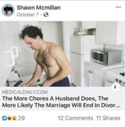 A sexist post suggesting only women should do housework states, “The more chores a husband does, the more likely a marriage is to end in divorce.”