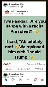 One meme refers to Barack Obama, the nation’s first African-American president, as “racist.”