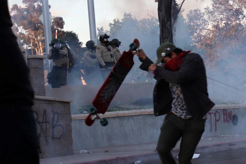 Photo, right by Henri Migala: Protesters were fired on with tear gas and pepper spray during a tense stand-off at the La Mesa Police Station on May 30.