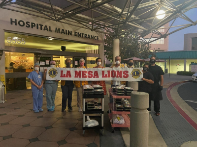 June 19, 2020 (La Mesa) – Members of the La Mesa Lions Club delivered meals to caregivers at Sharp Grossmont Hospital last month in appreciation for their efforts. Left to right, photo shows two nurses from an ICU unit on a COVID-19 floor, Lions Club Vice Presidents Joyce James and Mary Rynearson, Beth Morgante, CEO of Grossont Hospital Foundation and La Mesa Lions member David Shaw, Elbert Kim, La Mesa Lions Club President, and Cupid’s Caterers representatives.