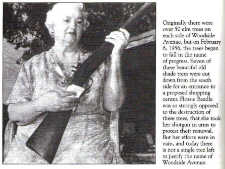 But in 1956, some trees were cut down for the entry to a proposed shopping center. Flossie Beadle was so staunchly opposed that she took up a shotgun in front of a bulldozer in protest, fighting to save the trees. She lost that battle, and today not a single Cork Elm tree remains.
