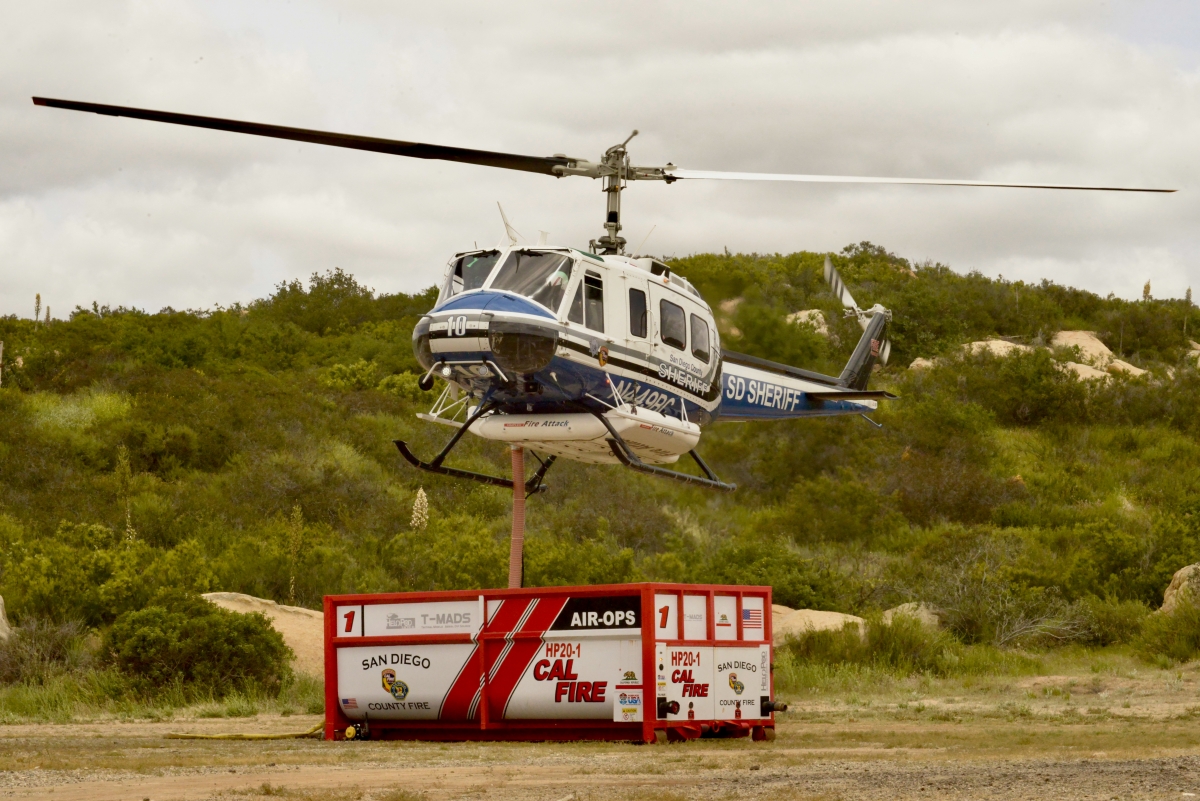 Photo, right: San Diego Sheriff's Copter makes dip in a portable HeliPod