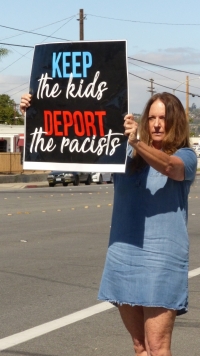 Left: A protester at Southwest Key in El Cajon from 2019
