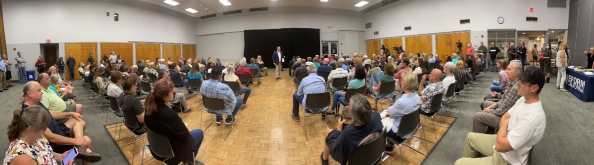 Photo, left, by Henri Migala: around 200 residents attended a forum in La Mesa organized by Carl DeMaio of Reform California, which opposes the mileage tax