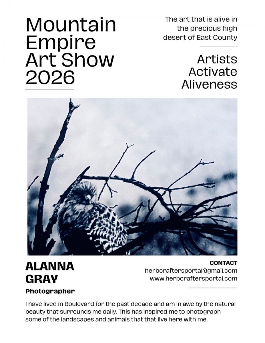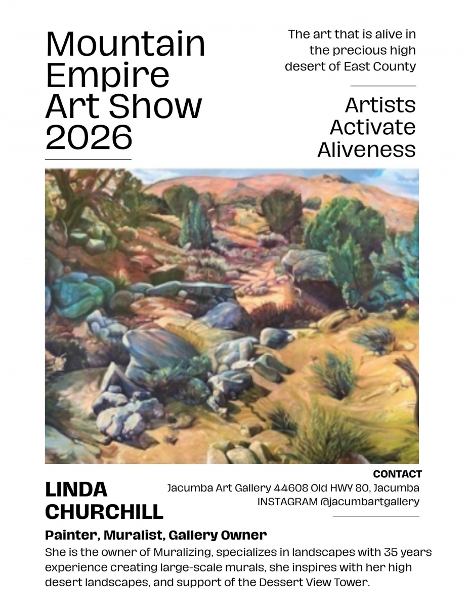 April 14, 2026 (Boulevard) -- The Backcountry Resource Center in Boulevard will be busy this Wednesday, April 15 hosting the first-ever Mountain Empire Art Show 2026, opening at 4 p.m. and the Boulevard-Jacumba Town Hall Event at 6:30 p.m.