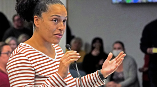 One of the women trying to remove Boller was Santee mom Danielle Wilkerson (photo, right). She was the next speaker but asked for 30 seconds to regain her composure, saying she was “a little shook up.”“What I just listened to was incredibly disrespectful. Incredibly hateful,” Wilkerson said. “And this woman has the audacity to call herself a Christian? … This woman is more of a threat than any trans person could ever be.”